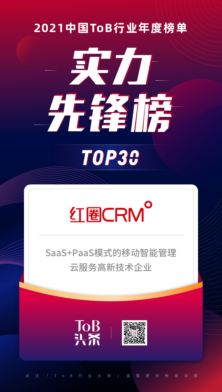 12月27日,「ToB行業(yè)頭條」聯(lián)手3W集團(tuán)正式發(fā)布了《2021ToB行業(yè)年度榜單·實(shí)力先鋒榜》,評(píng)選出了2021年ToB領(lǐng)域各賽道最具實(shí)力的先鋒企業(yè)TOP30。“和創(chuàng)科技(紅圈CRM)”作為數(shù)字化智能企業(yè)云服務(wù)領(lǐng)域的先鋒企業(yè),入選榜單行列!