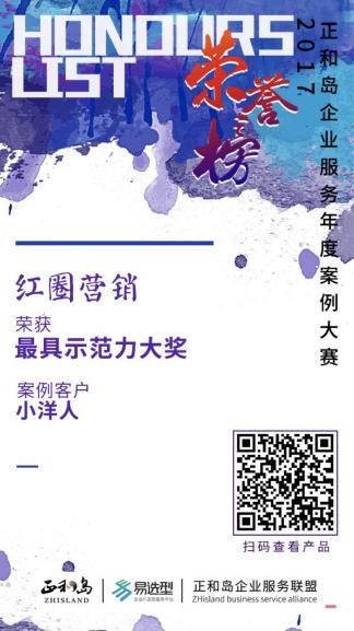 其中的正和島企業服務案例大賽評選,紅圈營銷憑借成功服務于中國馳名品牌小洋人的案例,獲得了“最具示范力”大獎,紅圈CRM同時成功入選億+計劃二期,彰顯了紅圈營銷在企業服務領域的超凡實力。
