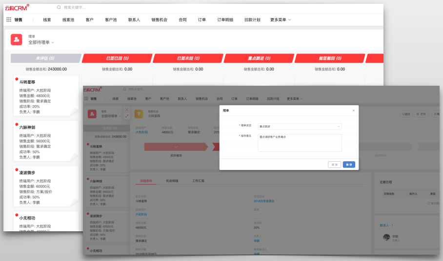 新版本在銷(xiāo)售機(jī)會(huì)階段推進(jìn)的過(guò)程中加?了“理單”環(huán)節(jié),提供了一個(gè)銷(xiāo)售管理者與?線銷(xiāo)售?員?對(duì)?評(píng)價(jià)指導(dǎo)的平臺(tái),管理層可以為銷(xiāo)售?員提供針對(duì)性的?作指導(dǎo),提高銷(xiāo)售成功率,并能更加客觀和準(zhǔn)確地做出銷(xiāo)售預(yù)測(cè)。對(duì)于理單條件和理單階段等的自定義設(shè)置,企業(yè)同樣可以在后臺(tái)實(shí)現(xiàn)。