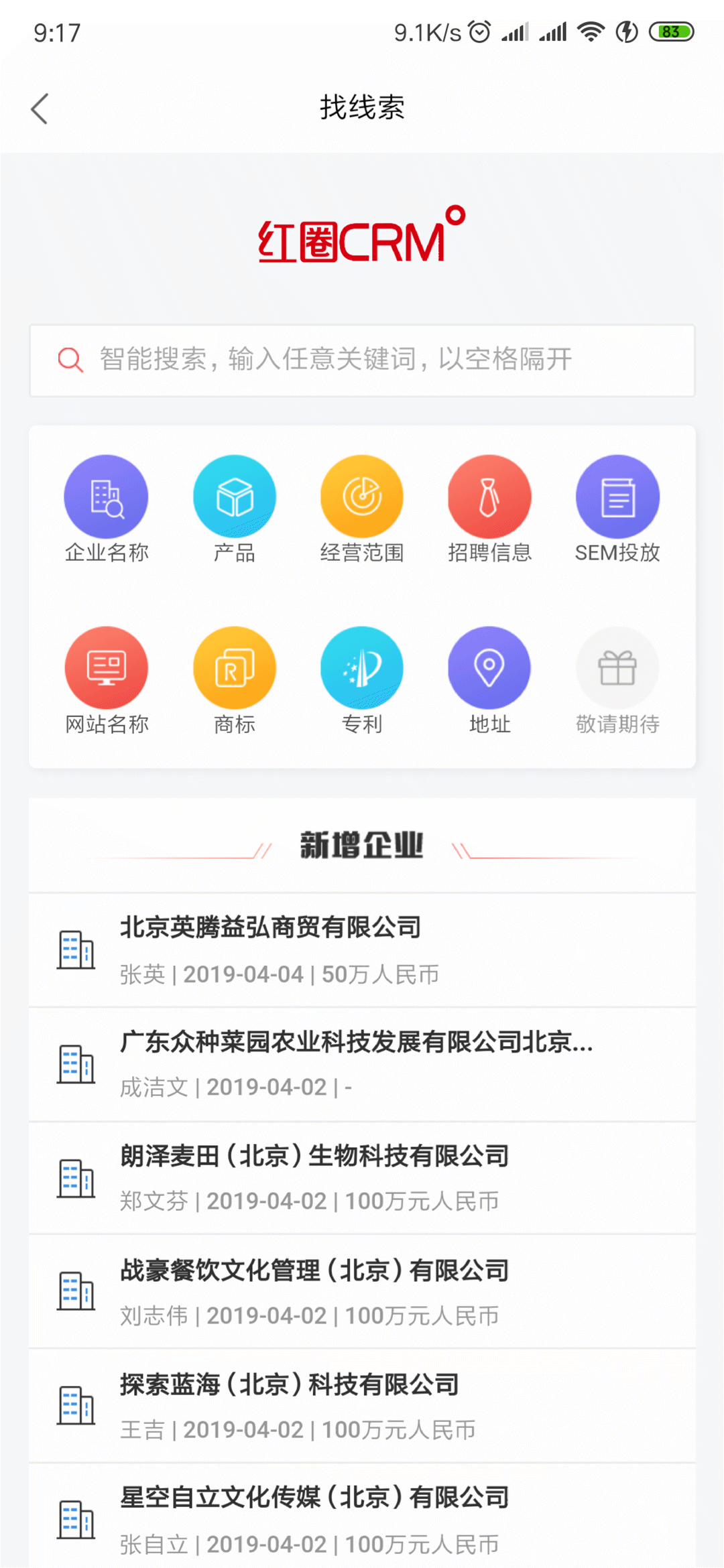 紅圈CRM V1094版本將為企業(yè)解決獲客渠道單?、線索來(lái)源不穩(wěn)定的難題,從源頭出發(fā),助力企業(yè)業(yè)績(jī)提升。銷(xiāo)售人員在“找線索”頁(yè)面輸入關(guān)鍵詞(如企業(yè)名稱(chēng)、產(chǎn)品、地址、招聘信息等)后,系統(tǒng)能夠基于全網(wǎng)大數(shù)據(jù)信息采集,從海量數(shù)據(jù)中精準(zhǔn)、快速地篩選出符合客戶畫(huà)像的優(yōu)質(zhì)資源,銷(xiāo)售人員能夠獲取企業(yè)完整信息以及相關(guān)聯(lián)系人、電話等精準(zhǔn)信息,并可?鍵轉(zhuǎn)為銷(xiāo)售線索,將重要信息保存到系統(tǒng)中。