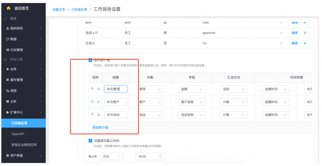 - 后臺設置:系統(tǒng)設置——擴展中心——已安裝應用——工作報告,類型設置支持新建類型;在模板設置中,可以按業(yè)務類型設置不同的字段和統(tǒng)計值;統(tǒng)計值設置,支持自定義名稱;