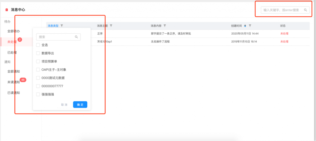 - 消息通知的類型和主題進行了規(guī)范,便于進行分類和篩選;每條消息可明確看到業(yè)務來源,主題更加清晰,大幅度減少了以“通知”為標題的消息;同時查看或處理變?yōu)檎锌牲c擊;消息支持篩選和搜索,也可以直接搜索內容或主題;待辦和通知的狀態(tài)變化更加智能,去除了手動按鈕操作,當處理或查看詳情后,狀態(tài)會自動變化;同時優(yōu)化了紅點顯示數(shù)量的刷新機制,更新更及時.