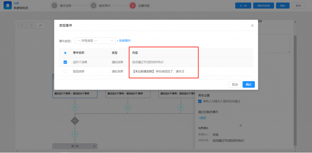 2)審批流節(jié)點(diǎn),可配置當(dāng)與提交人相同時,自動通過,減少重復(fù)操作