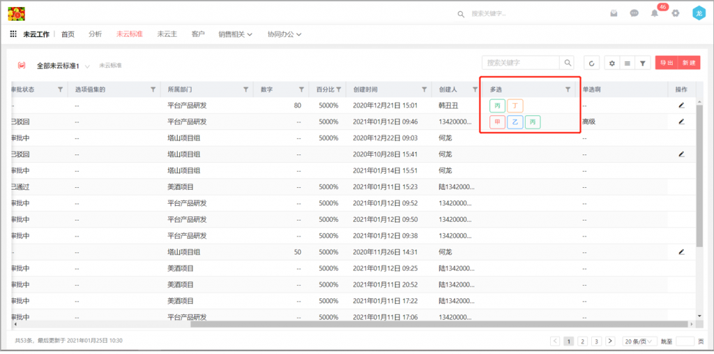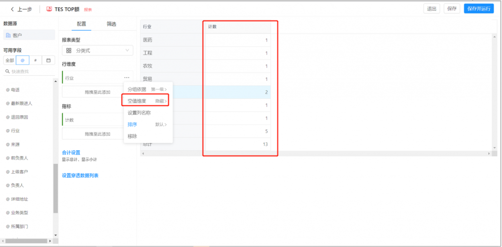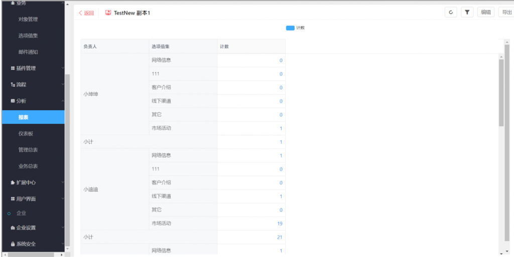 2)選項值集的單選字段,在作為維度時,可以分層級統(tǒng)計,類似部門;比如選擇一級進(jìn)行查看,每行維度會匯總當(dāng)前一級選項以及所有下級選項的數(shù)據(jù)