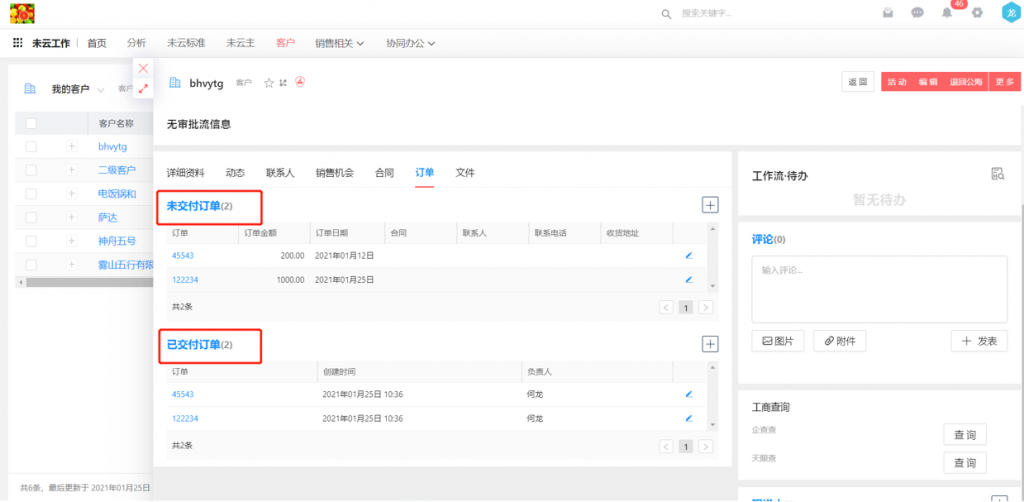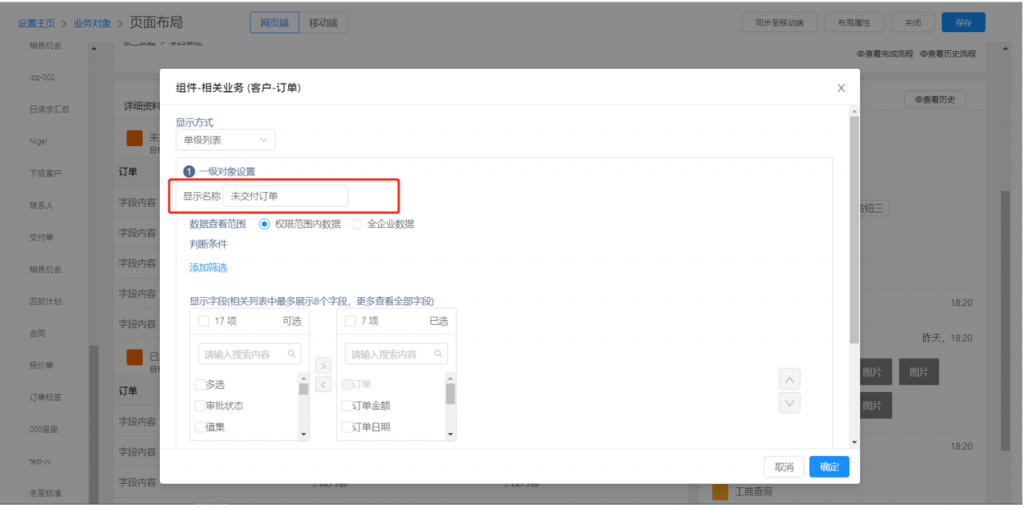 4)對象詳情頁相關(guān)列表組件可修改名稱,如在客戶詳情頁中,可以配置兩個訂單列表,分別命名為已交付訂單和未交付訂單