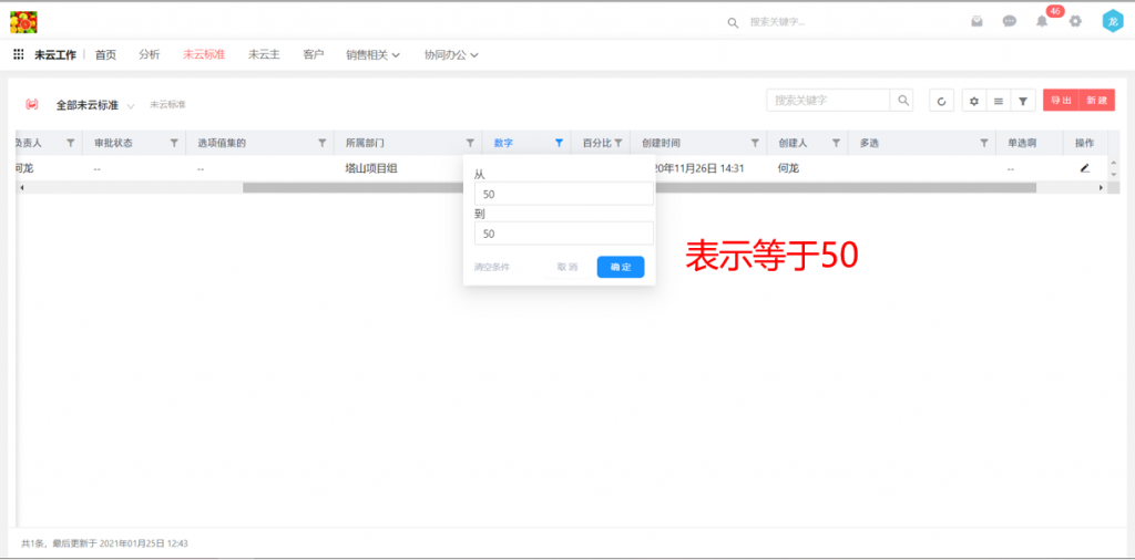 7)數(shù)據(jù)列表中,數(shù)值型字段在表頭篩選時可以只輸入一邊,或者兩邊輸入相同數(shù)值,進(jìn)行篩選