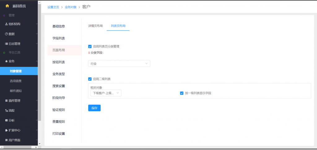 對象列表布局,設(shè)置二姐列表功能時,如果選擇的下游對象是本對象,則可以選擇按一節(jié)大列表顯示字段配置,也可以自己手動配置