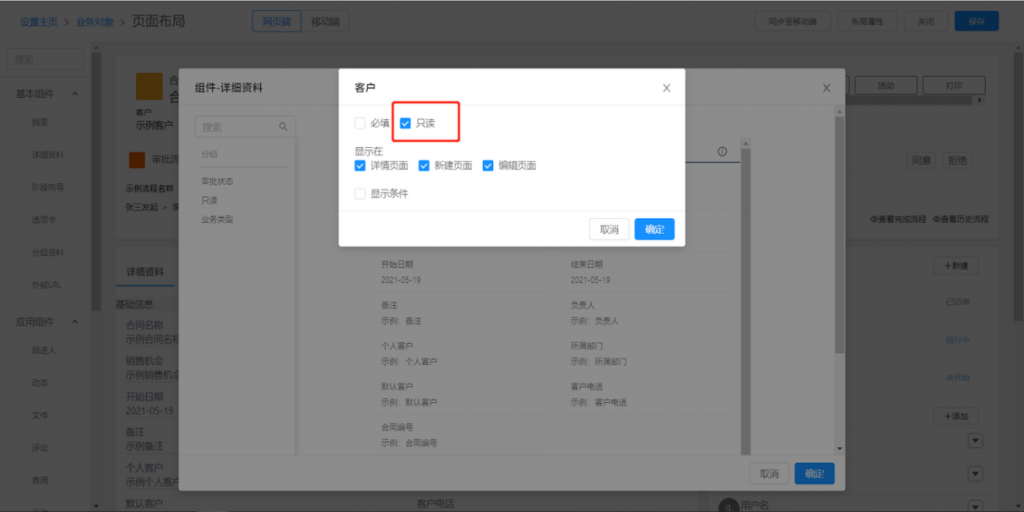 - 頁面布局字段可配置只讀:頁面布局-詳細資料組件中,字段可配置只讀屬性,在新建或編輯時,字段不可手動填寫,但默認值可正常計算