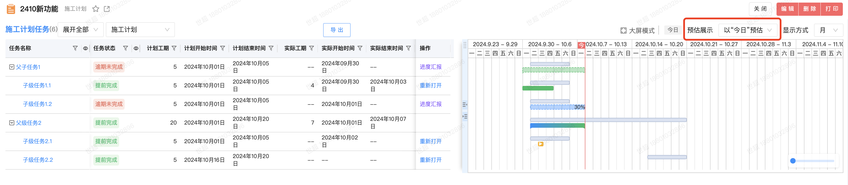 ● 支持以“今日”預估 任務進展的橫道圖展示