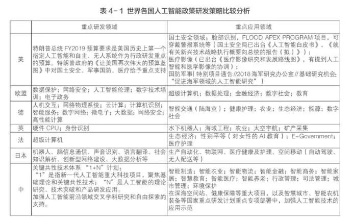 1)國際比較:各國人工智能戰略與政策各有重點。中國人工智能政策聚焦于實現人工智能領域的產業化,助力中國的制造強國政策。