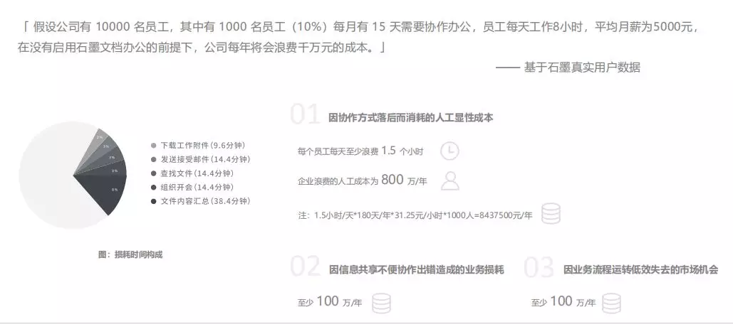 集腋成裘,員工每天花費(fèi)在傳輸文件、查找文件、內(nèi)容匯總、文件傳輸上的時(shí)間并不是個(gè)小數(shù)目。對(duì)于一家10000 人規(guī)模的企業(yè)來說,每天至少要耗費(fèi) 90 分鐘的無效時(shí)間,這直接導(dǎo)致企業(yè)每年需要付出將近 800 萬元的無效成本。