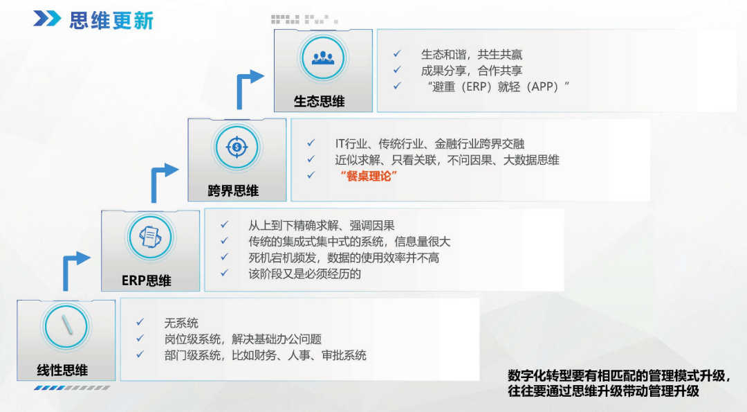 思維模式可以分為線性思維、ERP思維、跨界思維和生態(tài)思維。不同的思維方式會影響企業(yè)數(shù)字化的進(jìn)程(圖6)。