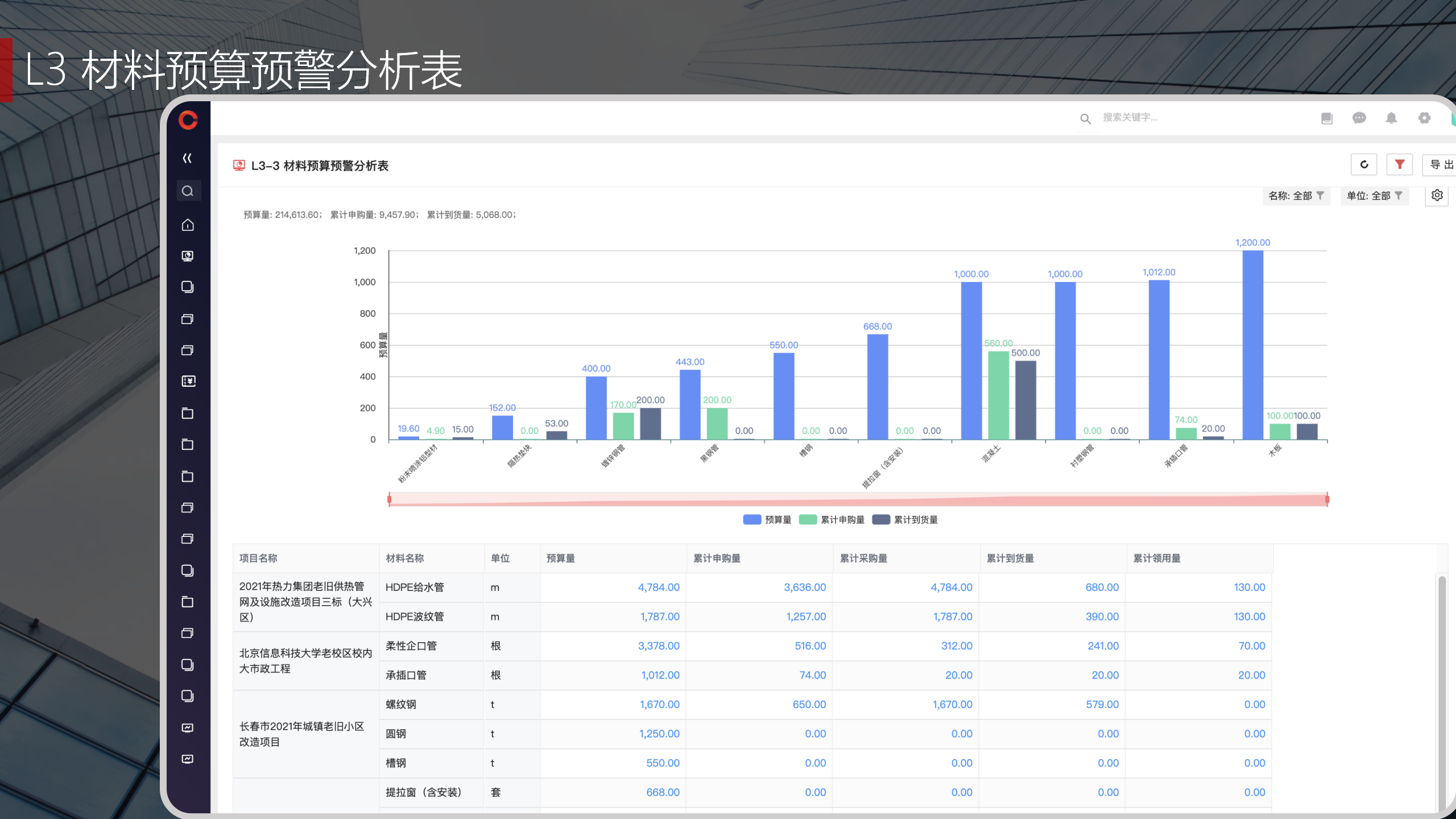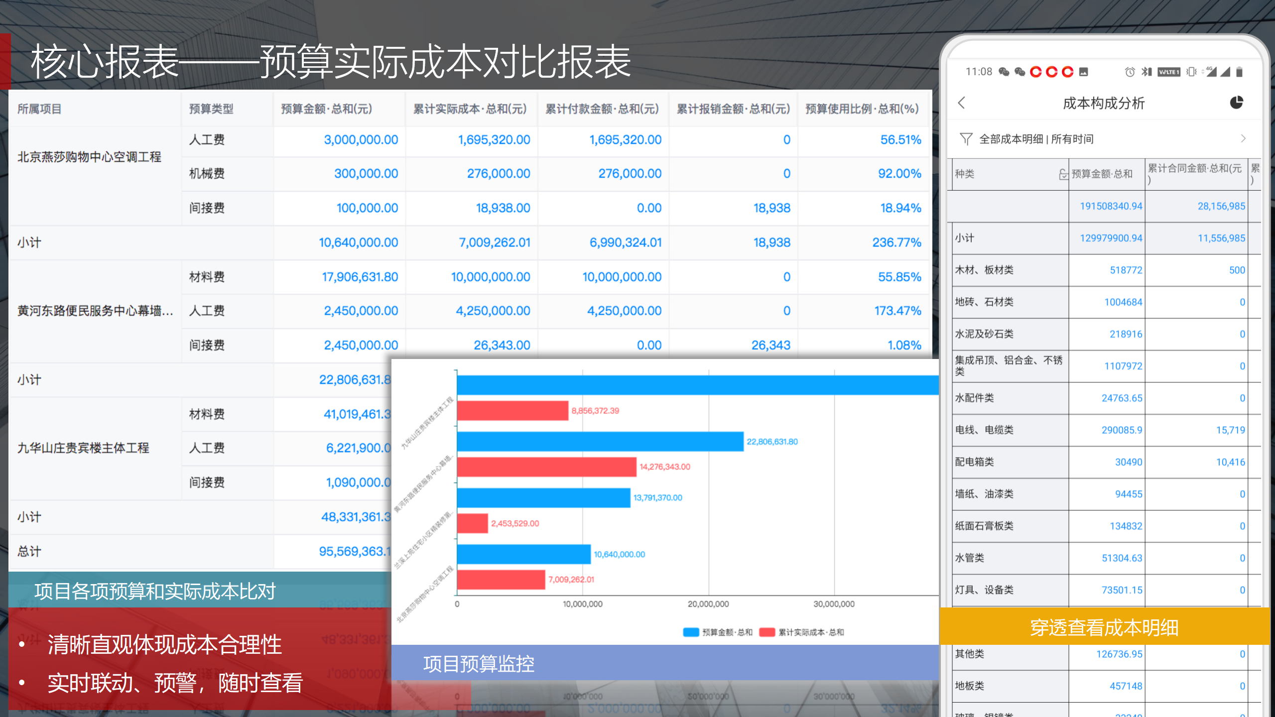 紅圈系統在PaaS平臺基礎上,根據工程項目管理的實際情況,通過人力資源管理、資金管理、成本管理、物資管理、安全質量管理、招投標管理、合同管理、勞務管理等功能模塊,利用報表引擎實時動態抓取項目管理過程中的相關數據,實時動態展現公司整體項目運營情況。當某項科目設定額度一旦超出計劃指標時,系統會自動發送動態預警。為公司領導決策實時呈現動態智能數據分析,讓公司領導實時了解工程項目的整體運營效率及效益是否達標,經營風險是否可控,真正做到項目管理心中有“數”,滿足公司對信息化管理的需求,提升公司經營管理能力,實現工程項目全過程管理的降本增效。
