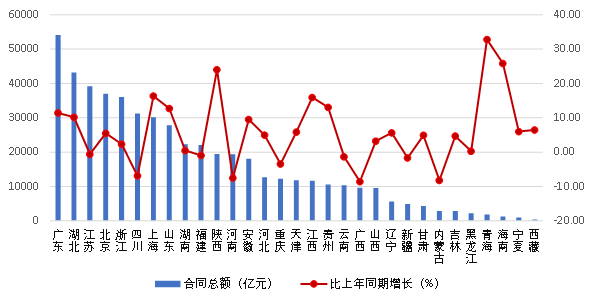 圖 6 2023 年上半年各地區(qū)建筑業(yè)企業(yè)合同總額及其增長情況2023年上半年,江蘇、廣東、湖北、浙江四省建筑業(yè)企業(yè)新簽合同額均超過10000億元,分別達(dá)到13974.12億元、13882.98億元、12964.71億元和10731.51億元。新簽合同額超過6000億元的還有山東、四川、北京、福建、陜西、上海、湖南、安徽等8 個地區(qū)。新簽合同額同比增長最快的是青海,達(dá)到了91.68%。西藏、海南、天津、陜西、吉林、湖北、上海、內(nèi)蒙古、山東、江蘇的增幅也都超過了 10%。12個地區(qū)新簽合同額出現(xiàn)負(fù)增長,其中廣西、河南、新疆的負(fù)增長均超過15%(圖7)。圖 7 2023 年上半年各地區(qū)建筑業(yè)企業(yè)新簽合同額及其增長情況