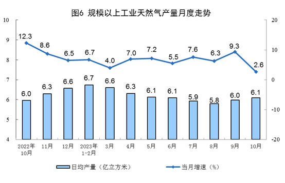 天然氣生產(chǎn)保持平穩(wěn),進(jìn)口增速加快。10月份,生產(chǎn)天然氣190億立方米,同比增長(zhǎng)2.6%,增速比9月份回落6.7個(gè)百分點(diǎn),日均產(chǎn)量6.1億立方米。進(jìn)口天然氣879萬(wàn)噸,同比增長(zhǎng)15.5%,增速比9月份加快15.1個(gè)百分點(diǎn)。
