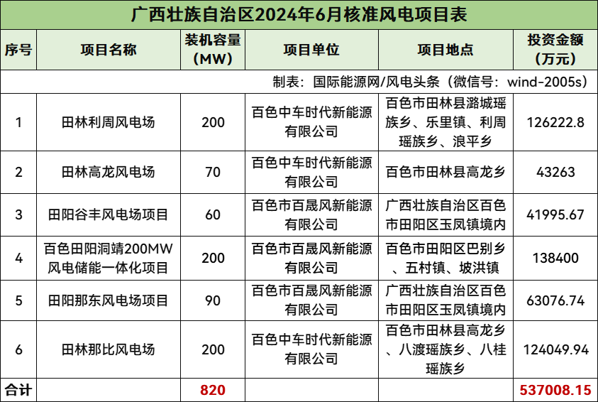 廣西核準6個風電項目,總規模820MW,總投資537008.15萬元,均為陸上風電項目。
