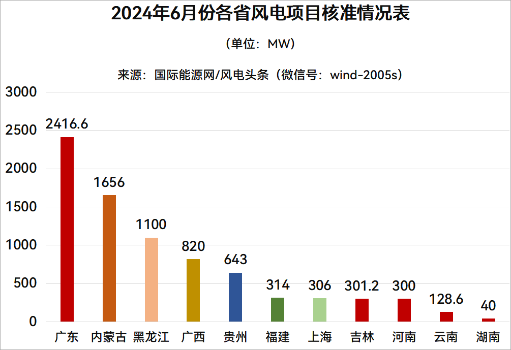 2024年6月風電項目獲核準的省份分別是廣東、內蒙古、黑龍江、廣西、貴州、福建、上海、吉林、河南、云南、湖南等11個省份。