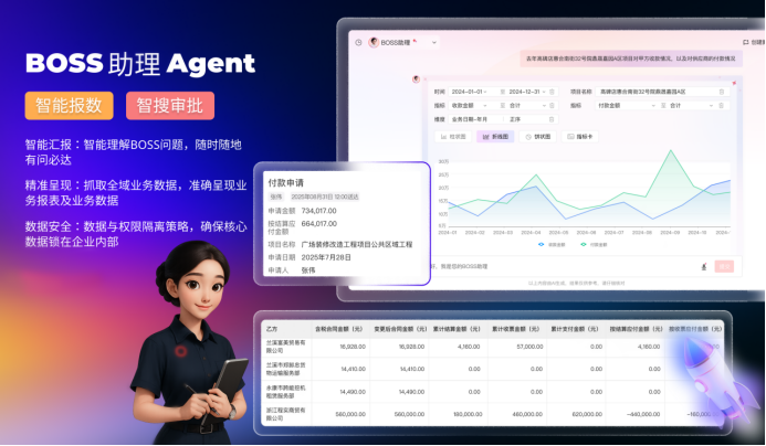 在具體應(yīng)用中,BOSS助理可快速鎖定數(shù)據(jù),例如查詢“張偉昨天提交的審批”,AI通過意圖識別下發(fā)指令,系統(tǒng)在判斷權(quán)限后返回列表,精準(zhǔn)調(diào)取對應(yīng)審批,實(shí)現(xiàn)急事優(yōu)先快速處理。此外,它還能響應(yīng)諸如“查看高碑店項(xiàng)目各供應(yīng)商支付情況”的復(fù)雜查詢,直接呈現(xiàn)合同金額、結(jié)算金額、支付金額等關(guān)鍵指標(biāo),幫助管理者快速發(fā)現(xiàn)異常并追溯源頭。
