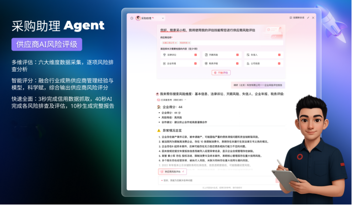 采購助理具備多維評估、智能評分和快速全面三大特點(diǎn)。它基于六大維度數(shù)據(jù)采集——包括企業(yè)基礎(chǔ)信息、年報(bào)、法律訴訟、失信人、天眼風(fēng)險(xiǎn)、納稅評級,逐項(xiàng)風(fēng)險(xiǎn)排查分析,融合行業(yè)成熟供應(yīng)商管理經(jīng)驗(yàn)與模型,科學(xué)賦分,綜合輸出供應(yīng)商風(fēng)險(xiǎn)評分。整個(gè)過程極速高效:3秒完成信用數(shù)據(jù)抓取,40秒AI完成各風(fēng)險(xiǎn)排查及評估,10秒生成完整報(bào)告。