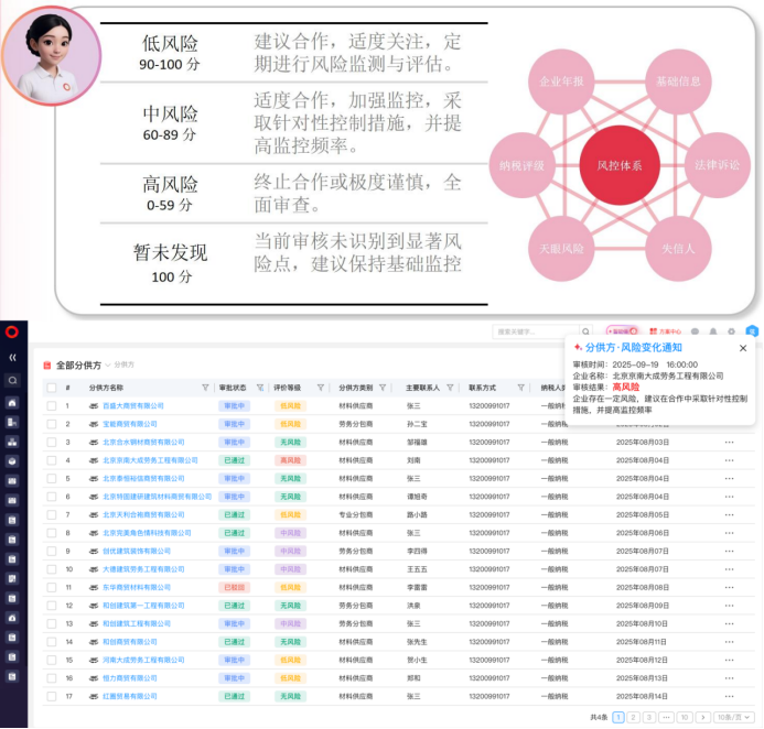 根據(jù)評分結(jié)果,供應(yīng)商被劃分為低風(fēng)險(xiǎn)(90-100分)、中風(fēng)險(xiǎn)(60-89分)、高風(fēng)險(xiǎn)(0-59分)和暫未發(fā)現(xiàn)風(fēng)險(xiǎn)(100分)四類,并分別給出“建議合作,適度關(guān)注”“適度合作,加強(qiáng)監(jiān)控”或“終止合作,全面審查”等建議。例如,在評估某供應(yīng)商時(shí),系統(tǒng)會詳細(xì)列出其法律訴訟情況、納稅評級等,幫助企業(yè)全面判斷合作風(fēng)險(xiǎn)。