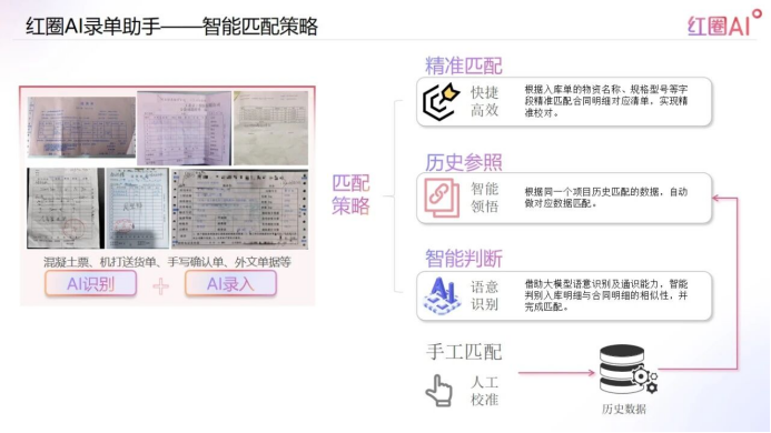 錄單助手還具備智能匹配與成本歸集能力,能智能分析入庫材料匹配的合同明細(xì)并掛接,厘清成本發(fā)生源頭,方便后期實(shí)際成本精準(zhǔn)統(tǒng)計(jì)及溯源。其匹配策略包括三重機(jī)制:精準(zhǔn)匹配(根據(jù)物資名稱、規(guī)格型號校對合同明細(xì))、歷史參照(依據(jù)同一項(xiàng)目歷史數(shù)據(jù)自動匹配)、智能判斷(借助大模型語意識別相似性),確保錄入既快又準(zhǔn)。