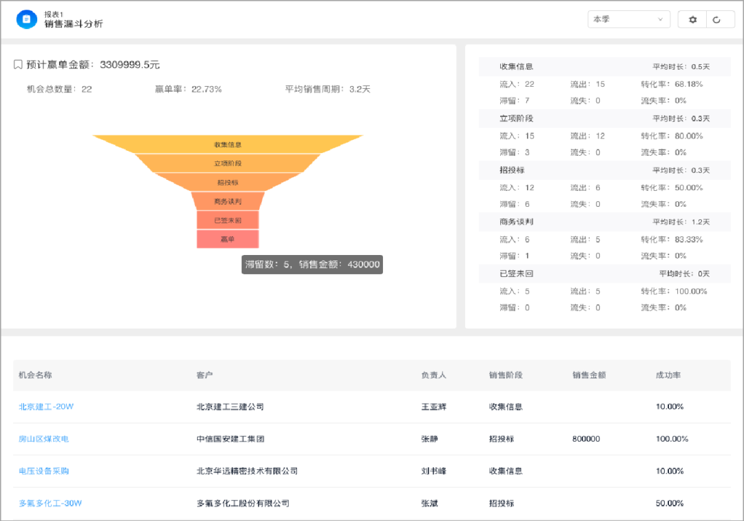 ○ 商機管理模塊(項目迷霧一掃光): 為公司構建項目商機推進轉化漏斗,清晰展示各階段項目數量及分布,幫助管理層快速鎖定需重點關注的商機,合理調配資源,加速項目轉化。