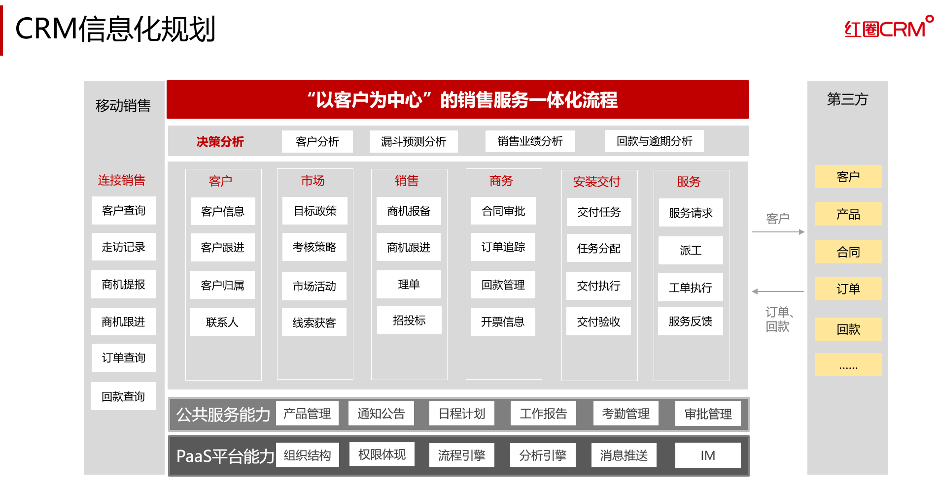 聚焦裝備制造企業(yè),其產(chǎn)品多呈現(xiàn)為大型復(fù)雜、個(gè)性化、定制化和小批量等特點(diǎn),且在產(chǎn)品制造、裝備制造售后服務(wù)等業(yè)務(wù)環(huán)節(jié)都可能會(huì)有產(chǎn)品設(shè)計(jì)與工藝方案的調(diào)整,企業(yè)的業(yè)務(wù)模式具有明顯的多元化、個(gè)性化和碎片化特征,制造業(yè)企業(yè)必然面臨商業(yè)模式和管理模式雙重挑戰(zhàn)。為打通與改善企業(yè)從市場營銷、銷售、研發(fā)、采購、制造到客戶服務(wù)等核心業(yè)務(wù)環(huán)節(jié),借助紅圈CRM打造統(tǒng)一客戶交互平臺(tái),提升管理質(zhì)效,為客戶創(chuàng)造更大的價(jià)值。